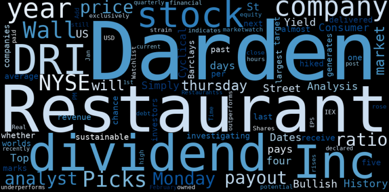 How much time have you spent trying to decide whether investing in Darden Restaurants? Many investors start with the dream of being free. They expect to find on the stock market an option to have time to develop their own interests and hobbies. That is, a way to escape a 9 to 5 job. However, investment is complex and investors end up spending whole days (and nights) trying to figure out which the right stock to invest is. The dream of stock investing becomes the nightmare of facing infinity amounts of information. As a solution, we programmed an artificial intelligence that reads the whole internet and the uses natural language processing and vectorizers to summarize the information. Usually, the AI reads several hundred pages and summarize it to a short document. This document presents our results. We found that the most common words in the internet about Darden Restaurants are: Darden, Restaurants, dividend, Inc, DRI, company, year, and the most common words in the summary are: darden, restaurant, stock, inc, dividend, analyst, news, . One of the sentences in the summary was: pays a US$1.31 dividend in just four days. Other searches related to this term that the AI found were: stockmarketlive, livestock, stockmarketforbeginners, thestockmarket, stockmarkettoday, stockmarkettrading, stockmarketstocks, todaystockmarket, thestockmarket, marketnews, stockmarketnews, whatisstockmarket, usstockmarket, stockmarketopen. #darden #restaurant #stock #inc #dividend #analyst #news.