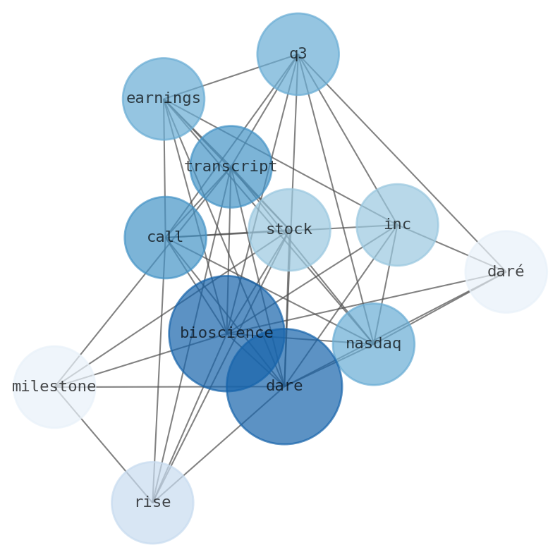 The game is changing. There is a new strategy to evaluate Dare Bioscience fundamental value, possible risks and most salient advantages. Investors have traditionally relied in reading large amounts of text to evaluate the fundamental value of a stock or company. However, the development of Artificial Intelligence (AI) tools is modifying the way investments are evaluated in markets. Today, machine learning, natural language processing and bigdata allow making this process automatic, reducing large amounts of text to the elements that have a higher activation in a neural network. We programmed an artificial intelligence that reads the whole internet and the uses natural language processing and vectorizers to summarize the information. Usually, the AI reads several hundred pages and summarize it to a short document. This document presents our results. We found that the most common words in the internet about Dare Bioscience are: Daré, Bioscience, inc, NASdaqDARE, q3, earnings, call, …