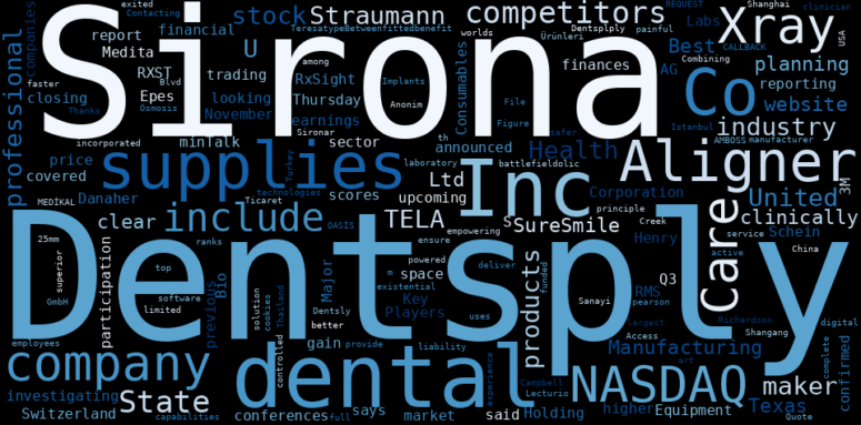 How much time have you spent trying to decide whether investing in Dentsply Sirona? Many investors start with the dream of being free. They expect to find on the stock market an option to have time to develop their own interests and hobbies. That is, a way to escape a 9 to 5 job. However, investment is complex and investors end up spending whole days (and nights) trying to figure out which the right stock to invest is. The dream of stock investing becomes the nightmare of facing infinity amounts of information. As a solution, we programmed an artificial intelligence that reads the whole internet and the uses natural language processing and vectorizers to summarize the information. Usually, the AI reads several hundred pages and summarize it to a short document. This document presents our results. We found that the most common words in the internet about Dentsply Sirona are: …
