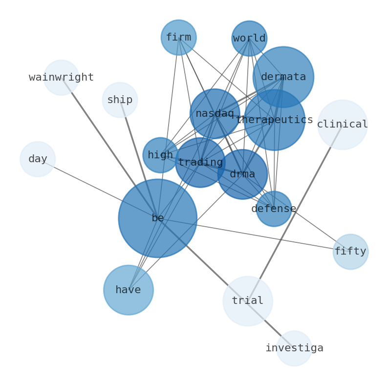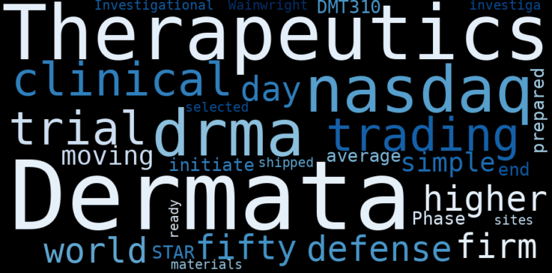 This document will help you to evaluate Dermata Therapeutics without reading an infinite amount of sources. Relying only on stock quotes or prices to make investment decisions is a mistake. Analyzing and observing stock charts, highs and lows and other numerical data does not allow to evaluate the real value of a company. Stock quotes and prices are the result of underlying characteristics of a company and of events and news happening around them. For this reason, investing must be based on information, not numbers. As a solution, we programmed an artificial intelligence that reads the whole internet and the uses natural language processing and vectorizers to summarize the information. Usually, the AI reads several hundred pages and summarize it to a short document. This document presents our results. We found that the most common words in the internet about Dermata Therapeutics are: Dermata, Therapeutics, trading, trial, nasdaqdrma, high, defense, …