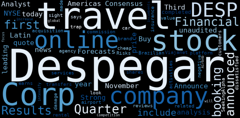 How much time have you spent trying to decide whether investing in Despegar? Many investors start with the dream of being free. They expect to find on the stock market an option to have time to develop their own interests and hobbies. That is, a way to escape a 9 to 5 job. However, investment is complex and investors end up spending whole days (and nights) trying to figure out which the right stock to invest is. The dream of stock investing becomes the nightmare of facing infinity amounts of information. As a solution, we programmed an artificial intelligence that reads the whole internet and the uses natural language processing and vectorizers to summarize the information. Usually, the AI reads several hundred pages and summarize it to a short document. This document presents our results. We found that the most common words in the internet about Despegar are: Despegarcom, Corp, …