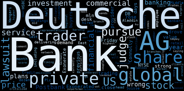How much time have you spent trying to decide whether investing in Deutsche Bank AG? Many investors start with the dream of being free. They expect to find on the stock market an option to have time to develop their own interests and hobbies. That is, a way to escape a 9 to 5 job. However, investment is complex and investors end up spending whole days (and nights) trying to figure out which the right stock to invest is. The dream of stock investing becomes the nightmare of facing infinity amounts of information. As a solution, we programmed an artificial intelligence that reads the whole internet and the uses natural language processing and vectorizers to summarize the information. Usually, the AI reads several hundred pages and summarize it to a short document. This document presents our results. We found that the most common words in the internet about Deutsche Bank …