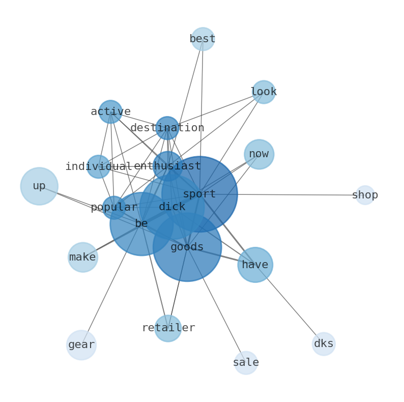 This document will help you to evaluate Dicks Sporting Goods without reading an infinite amount of sources. Relying only on stock quotes or prices to make investment decisions is a mistake. Analyzing and observing stock charts, highs and lows and other numerical data does not allow to evaluate the real value of a company. Stock quotes and prices are the result of underlying characteristics of a company and of events and news happening around them. For this reason, investing must be based on information, not numbers. As a solution, we programmed an artificial intelligence that reads the whole internet and the uses natural language processing and vectorizers to summarize the information. Usually, the AI reads several hundred pages and summarize it to a short document. This document presents our results. We found that the most common words in the internet about Dicks Sporting Goods are: Dicks, Goods, Sporting, sport, gear, …