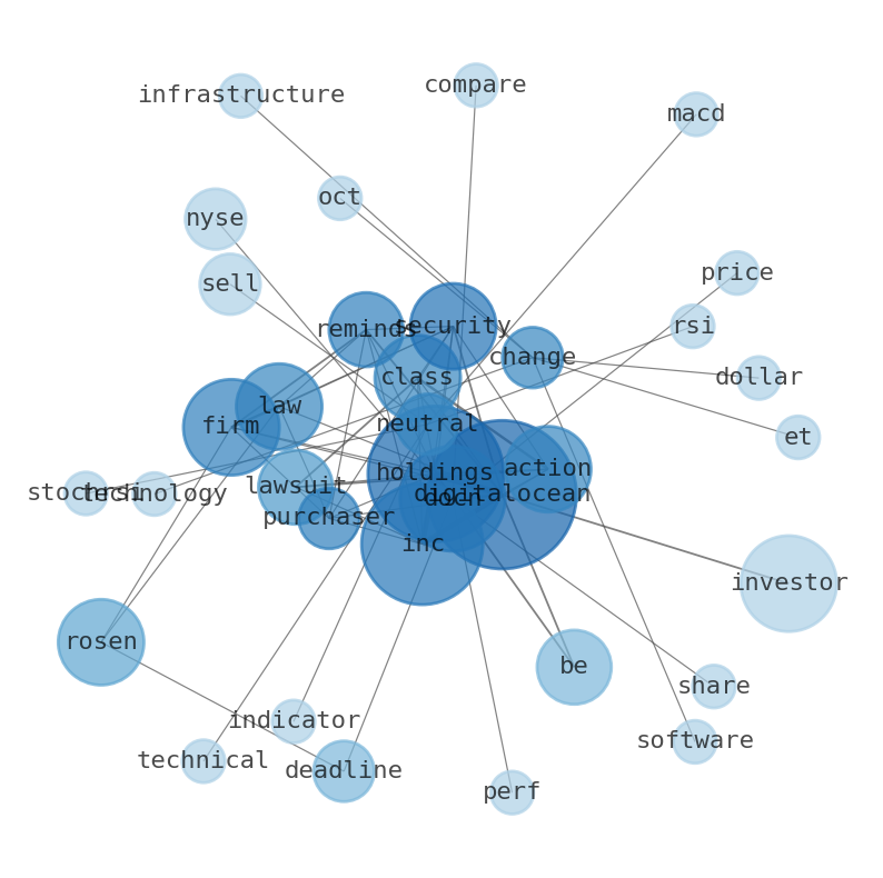 Are looking for the most relevant information about DigitalOcean Holdings? Investor spend a lot of time searching for information to make investment decisions in DigitalOcean Holdings. This task is often burdensome and consumes huge amounts of free time. It also leads to mistakes due to fatigue and bounded rationality. As a solution, we programmed an artificial intelligence that reads the whole internet and the uses natural language processing and vectorizers to summarize the information. Usually, the AI reads several hundred pages and summarize it to a short document. This document presents our results. We found that the most common words in the internet about DigitalOcean Holdings are: DigitalOcean, Holdings, Inc, investor, security, class, action, and the most common words in the summary are: digitalocean, stock, holding, inc, investor, docn, market, . One of the sentences in the summary was: DigitalOcean Holdings s ( DOCN ) share price is $22.94 , …