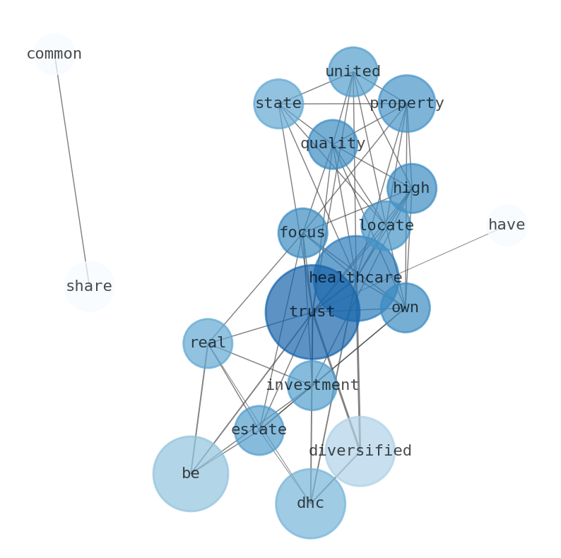 This document will help you to evaluate Diversified Healthcare Trust without reading an infinite amount of sources. Relying only on stock quotes or prices to make investment decisions is a mistake. Analyzing and observing stock charts, highs and lows and other numerical data does not allow to evaluate the real value of a company. Stock quotes and prices are the result of underlying characteristics of a company and of events and news happening around them. For this reason, investing must be based on information, not numbers. As a solution, we programmed an artificial intelligence that reads the whole internet and the uses natural language processing and vectorizers to summarize the information. Usually, the AI reads several hundred pages and summarize it to a short document. This document presents our results. We found that the most common words in the internet about Diversified Healthcare Trust are: Diversified, Healthcare, Trust, DHC, trust, …