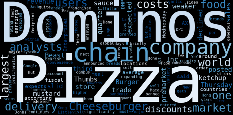 How much time have you spent trying to decide whether investing in Dominos Pizza? Many investors start with the dream of being free. They expect to find on the stock market an option to have time to develop their own interests and hobbies. That is, a way to escape a 9 to 5 job. However, investment is complex and investors end up spending whole days (and nights) trying to figure out which the right stock to invest is. The dream of stock investing becomes the nightmare of facing infinity amounts of information. As a solution, we programmed an artificial intelligence that reads the whole internet and the uses natural language processing and vectorizers to summarize the information. Usually, the AI reads several hundred pages and summarize it to a short document. This document presents our results. We found that the most common words in the internet about Dominos Pizza are: Dominos, Pizza, pizza, company, chain, analyst, country, and the most common words in the summary are: pizza, domino, dominos, restaurant, job, order, day, . One of the sentences in the summary was: Dominos Pizza Inc. Other searches related to this term that the AI found were: stockmarketlive, livestock, stockmarketforbeginners, thestockmarket, stockmarkettoday, stockmarkettrading, stockmarketstocks, todaystockmarket, thestockmarket, marketnews, stockmarketnews, whatisstockmarket, usstockmarket, stockmarketopen. #pizza #domino #dominos #restaurant #job #order #day.