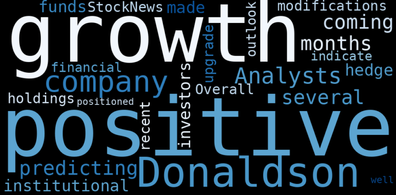 The game is changing. There is a new strategy to evaluate Donaldson Company fundamental value, possible risks and most salient advantages. Investors have traditionally relied in reading large amounts of text to evaluate the fundamental value of a stock or company. However, the development of Artificial Intelligence (AI) tools is modifying the way investments are evaluated in markets. Today, machine learning, natural language processing and bigdata allow making this process automatic, reducing large amounts of text to the elements that have a higher activation in a neural network. We programmed an artificial intelligence that reads the whole internet and the uses natural language processing and vectorizers to summarize the information. Usually, the AI reads several hundred pages and summarize it to a short document. This document presents our results. We found that the most common words in the internet about Donaldson Company are: positive, growth, company, Analysts, predict, Donaldson, come, …