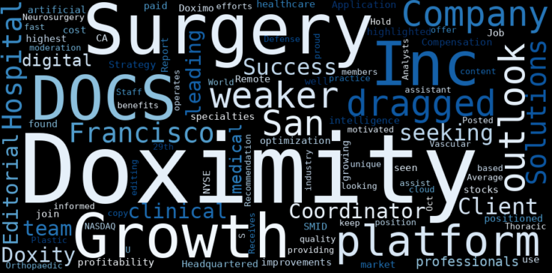 The game is changing. There is a new strategy to evaluate Doximity fundamental value, possible risks and most salient advantages. Investors have traditionally relied in reading large amounts of text to evaluate the fundamental value of a stock or company. However, the development of Artificial Intelligence (AI) tools is modifying the way investments are evaluated in markets. Today, machine learning, natural language processing and bigdata allow making this process automatic, reducing large amounts of text to the elements that have a higher activation in a neural network. We programmed an artificial intelligence that reads the whole internet and the uses natural language processing and vectorizers to summarize the information. Usually, the AI reads several hundred pages and summarize it to a short document. This document presents our results. We found that the most common words in the internet about Doximity are: Doximity, Surgery, Inc, platform, drag, doximity, Growth, and the …