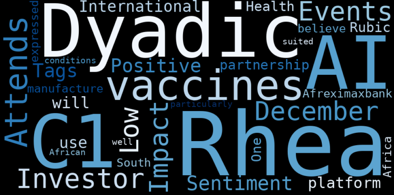 Dyadic Attends Investor Events in December Rhea-AI Impact (Low) Rhea AI Sentiment (Very Positive) Tags Rhea Dyadic International will use its C1 platform in partnership with Rubic One Health and Afreximaxbank to manufacture vaccines in South Africa. We believe that vaccines expressed from C1 are particularly well-suited for African conditions.
