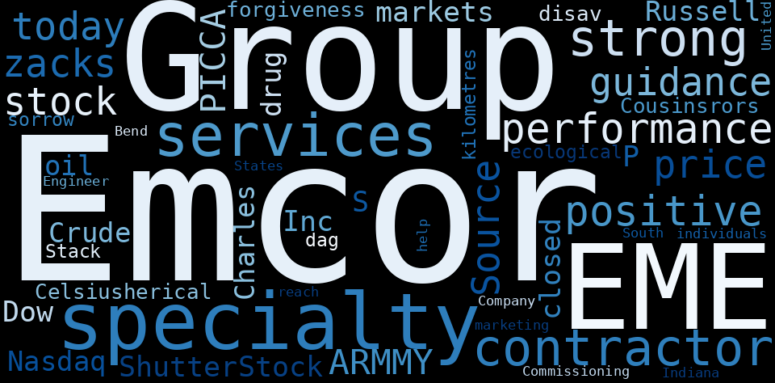 Are looking for the most relevant information about EMCOR Group? Investor spend a lot of time searching for information to make investment decisions in EMCOR Group. This task is often burdensome and consumes huge amounts of free time. It also leads to mistakes due to fatigue and bounded rationality. As a solution, we programmed an artificial intelligence that reads the whole internet and the uses natural language processing and vectorizers to summarize the information. Usually, the AI reads several hundred pages and summarize it to a short document. This document presents our results. We found that the most common words in the internet about EMCOR Group are: Emcor, Group, EME, group, EMCOR, specialty, service, and the most common words in the summary are: emcor, group, service, inc, job, company, news, . One of the sentences in the summary was: Emcor Group ( EME): The specialty services contractor had a strong performance and positive guidance. Other searches related to this term that the AI found were: stockmarketlive, livestock, stockmarketforbeginners, thestockmarket, stockmarkettoday, stockmarkettrading, stockmarketstocks, todaystockmarket, thestockmarket, marketnews, stockmarketnews, whatisstockmarket, usstockmarket, stockmarketopen. #emcor #group #service #inc #job #company #news.