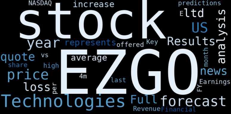 The game is changing. There is a new strategy to evaluate EZGO Technologies fundamental value, possible risks and most salient advantages. Investors have traditionally relied in reading large amounts of text to evaluate the fundamental value of a stock or company. However, the development of Artificial Intelligence (AI) tools is modifying the way investments are evaluated in markets. Today, machine learning, natural language processing and bigdata allow making this process automatic, reducing large amounts of text to the elements that have a higher activation in a neural network. We programmed an artificial intelligence that reads the whole internet and the uses natural language processing and vectorizers to summarize the information. Usually, the AI reads several hundred pages and summarize it to a short document. This document presents our results. We found that the most common words in the internet about EZGO Technologies are: stock, EZGO, Technologies, forecast, ezgo, price, Stock, …