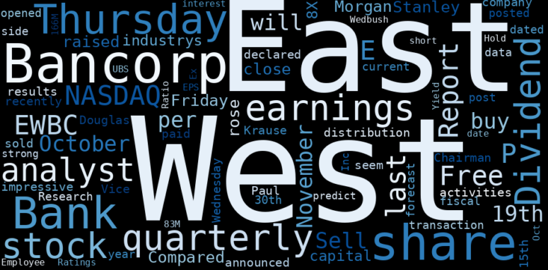 Are looking for the most relevant information about East West Bancorp? Investor spend a lot of time searching for information to make investment decisions in East West Bancorp. This task is often burdensome and consumes huge amounts of free time. It also leads to mistakes due to fatigue and bounded rationality. As a solution, we programmed an artificial intelligence that reads the whole internet and the uses natural language processing and vectorizers to summarize the information. Usually, the AI reads several hundred pages and summarize it to a short document. This document presents our results. We found that the most common words in the internet about East West Bancorp are: West, East, Bancorp, share, Thursday, Bank, quarterly, and the most common words in the summary are: west, east, bancorp, job, bank, stock, top, . One of the sentences in the summary was: Vice Chairman Douglas Paul Krause sold 12,000 shares …