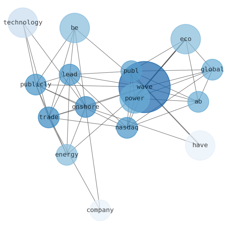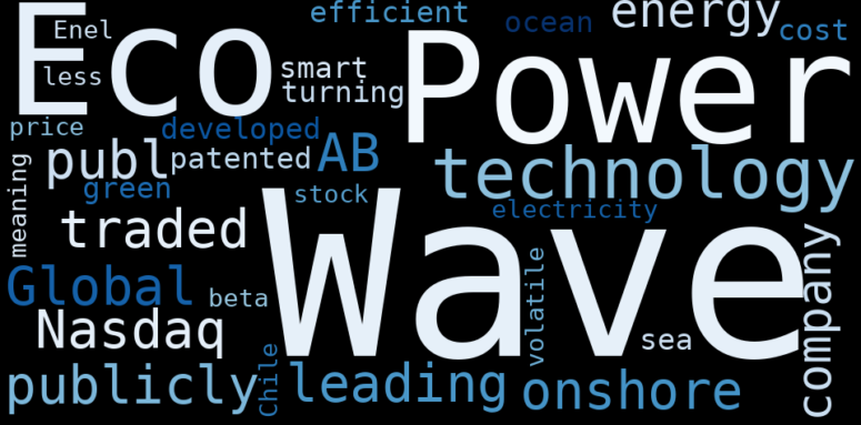How much time have you spent trying to decide whether investing in Eco Wave Power Global AB (publ)? Many investors start with the dream of being free. They expect to find on the stock market an option to have time to develop their own interests and hobbies. That is, a way to escape a 9 to 5 job. However, investment is complex and investors end up spending whole days (and nights) trying to figure out which the right stock to invest is. The dream of stock investing becomes the nightmare of facing infinity amounts of information. As a solution, we programmed an artificial intelligence that reads the whole internet and the uses natural language processing and vectorizers to summarize the information. Usually, the AI reads several hundred pages and summarize it to a short document. This document presents our results. We found that the most common words in the internet …