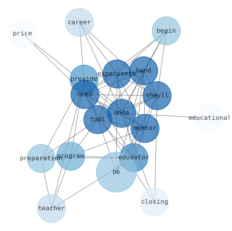 This document will help you to evaluate Educational Development without reading an infinite amount of sources. Relying only on stock quotes or prices to make investment decisions is a mistake. Analyzing and observing stock charts, highs and lows and other numerical data does not allow to evaluate the real value of a company. Stock quotes and prices are the result of underlying characteristics of a company and of events and news happening around them. For this reason, investing must be based on information, not numbers. As a solution, we programmed an artificial intelligence that reads the whole internet and the uses natural language processing and vectorizers to summarize the information. Usually, the AI reads several hundred pages and summarize it to a short document. This document presents our results. We found that the most common words in the internet about Educational Development are: Teacherpreparation, program, provide, educatorstobe, tool, mentor, handson, …