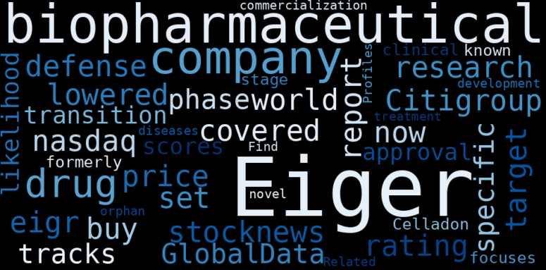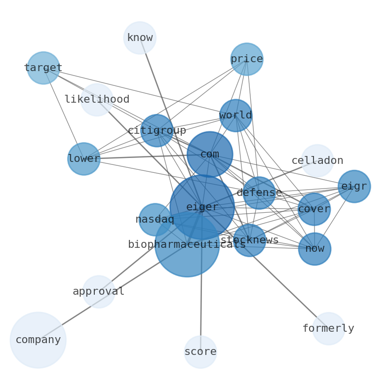 The game is changing. There is a new strategy to evaluate Eiger BioPharmaceuticals fundamental value, possible risks and most salient advantages. Investors have traditionally relied in reading large amounts of text to evaluate the fundamental value of a stock or company. However, the development of Artificial Intelligence (AI) tools is modifying the way investments are evaluated in markets. Today, machine learning, natural language processing and bigdata allow making this process automatic, reducing large amounts of text to the elements that have a higher activation in a neural network. We programmed an artificial intelligence that reads the whole internet and the uses natural language processing and vectorizers to summarize the information. Usually, the AI reads several hundred pages and summarize it to a short document. This document presents our results. We found that the most common words in the internet about Eiger BioPharmaceuticals are: Eiger, BioPharmaceuticals, company, eiger, biopharmaceuticals, nasdaqeigr, cover, and the most common words in the summary are: eiger, biopharmaceuticals, stock, inc, market, bloomberg, news, . One of the sentences in the summary was: eiger biopharmaceuticals (nasdaq:eigr) now covered by stocknews.com - defense world.com. Other searches related to this term that the AI found were: stockmarketlive, livestock, stockmarketforbeginners, thestockmarket, stockmarkettoday, stockmarkettrading, stockmarketstocks, todaystockmarket, thestockmarket, marketnews, stockmarketnews, whatisstockmarket, usstockmarket, stockmarketopen. #eiger #biopharmaceuticals #stock #inc #market #bloomberg #news.