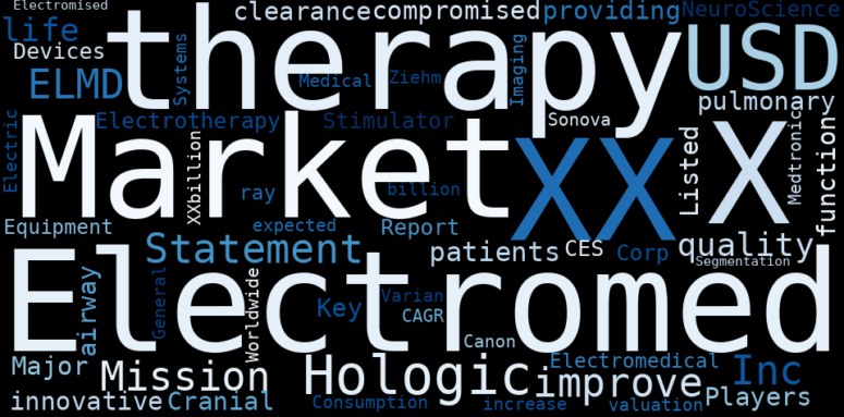 Are looking for the most relevant information about Electromed? Investor spend a lot of time searching for information to make investment decisions in Electromed. This task is often burdensome and consumes huge amounts of free time. It also leads to mistakes due to fatigue and bounded rationality. As a solution, we programmed an artificial intelligence that reads the whole internet and the uses natural language processing and vectorizers to summarize the information. Usually, the AI reads several hundred pages and summarize it to a short document. This document presents our results. We found that the most common words in the internet about Electromed are: Market, XX, USD, Hologic, Electromed, Inc, ELMD, and the most common words in the summary are: equipment, machine, technology, market, system, electromedical, medical, . One of the sentences in the summary was: (ELMD) Mission Statement: To improve the quality of life for patients with compromised pulmonary function by providing innovative airway clearance therapy Major Key Players Listed in Cranial Electrotherapy Stimulator (CES) Devices Market Report are: NeuroScience Therapy Corp Electromeds. Other searches related to this term that the AI found were: stockmarketlive, livestock, stockmarketforbeginners, thestockmarket, stockmarkettoday, stockmarkettrading, stockmarketstocks, todaystockmarket, thestockmarket, marketnews, stockmarketnews, whatisstockmarket, usstockmarket, stockmarketopen. #equipment #machine #technology #market #system #electromedical #medical.