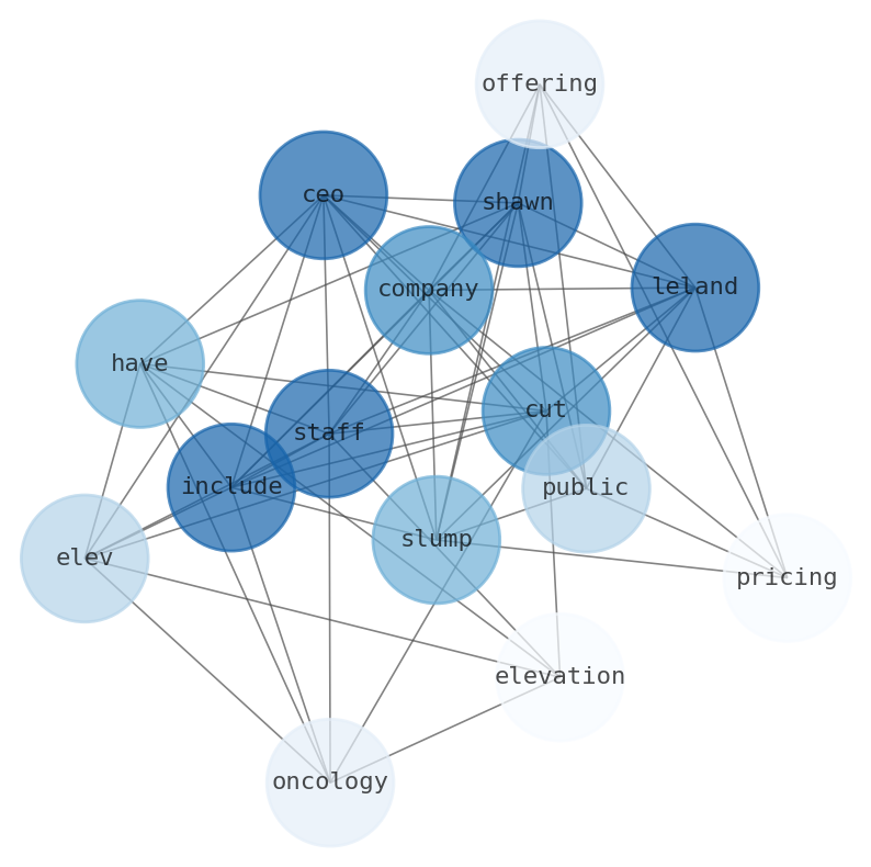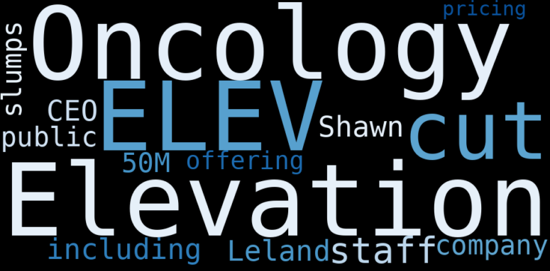 The game is changing. There is a new strategy to evaluate Elevation Oncology fundamental value, possible risks and most salient advantages. Investors have traditionally relied in reading large amounts of text to evaluate the fundamental value of a stock or company. However, the development of Artificial Intelligence (AI) tools is modifying the way investments are evaluated in markets. Today, machine learning, natural language processing and bigdata allow making this process automatic, reducing large amounts of text to the elements that have a higher activation in a neural network. We programmed an artificial intelligence that reads the whole internet and the uses natural language processing and vectorizers to summarize the information. Usually, the AI reads several hundred pages and summarize it to a short document. This document presents our results. We found that the most common words in the internet about Elevation Oncology are: Elevation, Oncology, ELEV, cut, staff, include, CEO, …