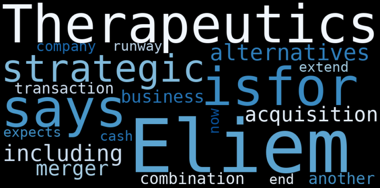 The game is changing. There is a new strategy to evaluate Eliem Therapeutics fundamental value, possible risks and most salient advantages. Investors have traditionally relied in reading large amounts of text to evaluate the fundamental value of a stock or company. However, the development of Artificial Intelligence (AI) tools is modifying the way investments are evaluated in markets. Today, machine learning, natural language processing and bigdata allow making this process automatic, reducing large amounts of text to the elements that have a higher activation in a neural network. We programmed an artificial intelligence that reads the whole internet and the uses natural language processing and vectorizers to summarize the information. Usually, the AI reads several hundred pages and summarize it to a short document. This document presents our results. We found that the most common words in the internet about Eliem Therapeutics are: Eliem, Therapeutics, say, isfor, strategic, alternative, include, …