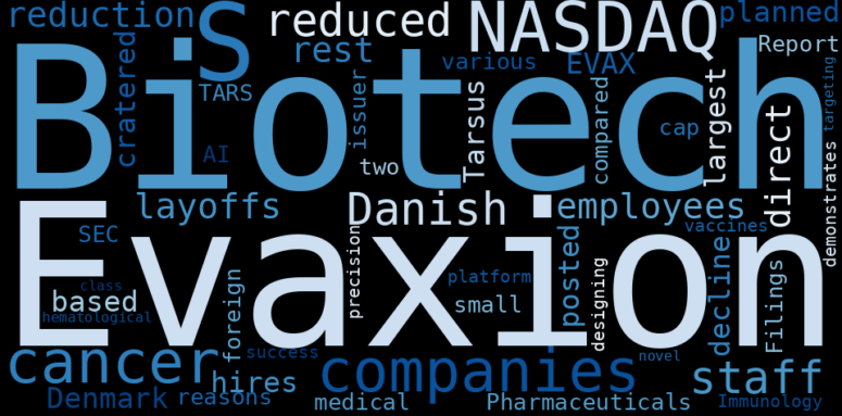 This document will help you to evaluate Evaxion Biotech without reading an infinite amount of sources. Relying only on stock quotes or prices to make investment decisions is a mistake. Analyzing and observing stock charts, highs and lows and other numerical data does not allow to evaluate the real value of a company. Stock quotes and prices are the result of underlying characteristics of a company and of events and news happening around them. For this reason, investing must be based on information, not numbers. As a solution, we programmed an artificial intelligence that reads the whole internet and the uses natural language processing and vectorizers to summarize the information. Usually, the AI reads several hundred pages and summarize it to a short document. This document presents our results. We found that the most common words in the internet about Evaxion Biotech are: Evaxion, Biotech, company, cancer, Danish, biotech, reduce, …