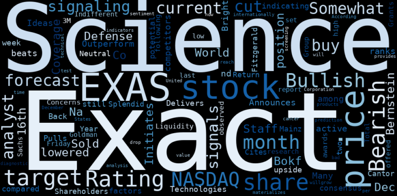 How much time have you spent trying to decide whether investing in Exact Sciences? Many investors start with the dream of being free. They expect to find on the stock market an option to have time to develop their own interests and hobbies. That is, a way to escape a 9 to 5 job. However, investment is complex and investors end up spending whole days (and nights) trying to figure out which the right stock to invest is. The dream of stock investing becomes the nightmare of facing infinity amounts of information. As a solution, we programmed an artificial intelligence that reads the whole internet and the uses natural language processing and vectorizers to summarize the information. Usually, the AI reads several hundred pages and summarize it to a short document. This document presents our results. We found that the most common words in the internet about Exact Sciences are: Sciences, Exact, stock, price, EXAS, signal, NASDAQEXAS, and the most common words in the summary are: science, exact, stock, job, price, company, rating, . One of the sentences in the summary was: Exact Sciences Corporation provides cancer screening and diagnostic test products.. Other searches related to this term that the AI found were: stockmarketlive, livestock, stockmarketforbeginners, thestockmarket, stockmarkettoday, stockmarkettrading, stockmarketstocks, todaystockmarket, thestockmarket, marketnews, stockmarketnews, whatisstockmarket, usstockmarket, stockmarketopen. #science #exact #stock #job #price #company #rating.