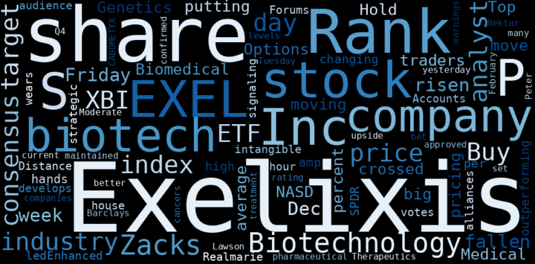 How much time have you spent trying to decide whether investing in Exelixis? Many investors start with the dream of being free. They expect to find on the stock market an option to have time to develop their own interests and hobbies. That is, a way to escape a 9 to 5 job. However, investment is complex and investors end up spending whole days (and nights) trying to figure out which the right stock to invest is. The dream of stock investing becomes the nightmare of facing infinity amounts of information. As a solution, we programmed an artificial intelligence that reads the whole internet and the uses natural language processing and vectorizers to summarize the information. Usually, the AI reads several hundred pages and summarize it to a short document. This document presents our results. We found that the most common words in the internet about Exelixis are: Exelixis, share, …