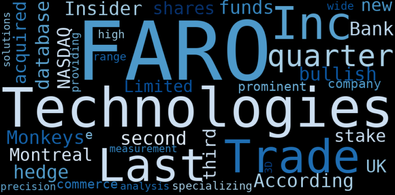 This document will help you to evaluate FARO Technologies without reading an infinite amount of sources. Relying only on stock quotes or prices to make investment decisions is a mistake. Analyzing and observing stock charts, highs and lows and other numerical data does not allow to evaluate the real value of a company. Stock quotes and prices are the result of underlying characteristics of a company and of events and news happening around them. For this reason, investing must be based on information, not numbers. As a solution, we programmed an artificial intelligence that reads the whole internet and the uses natural language processing and vectorizers to summarize the information. Usually, the AI reads several hundred pages and summarize it to a short document. This document presents our results. We found that the most common words in the internet about FARO Technologies are: Technologies, FARO, Faro, Inc, Last, Trade, trade, and the most common words in the summary are: faro, technology, scanner, job, grafana, laser, transcript, . One of the sentences in the summary was: Faro Technologies, Inc. Other searches related to this term that the AI found were: stockmarketlive, livestock, stockmarketforbeginners, thestockmarket, stockmarkettoday, stockmarkettrading, stockmarketstocks, todaystockmarket, thestockmarket, marketnews, stockmarketnews, whatisstockmarket, usstockmarket, stockmarketopen. #faro #technology #scanner #job #grafana #laser #transcript.