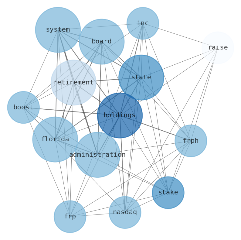 This document will help you to evaluate FRP Holdings without reading an infinite amount of sources. Relying only on stock quotes or prices to make investment decisions is a mistake. Analyzing and observing stock charts, highs and lows and other numerical data does not allow to evaluate the real value of a company. Stock quotes and prices are the result of underlying characteristics of a company and of events and news happening around them. For this reason, investing must be based on information, not numbers. As a solution, we programmed an artificial intelligence that reads the whole internet and the uses natural language processing and vectorizers to summarize the information. Usually, the AI reads several hundred pages and summarize it to a short document. This document presents our results. We found that the most common words in the internet about FRP Holdings are: State, Board, Administration, Florida, Retirement, System, boost, …