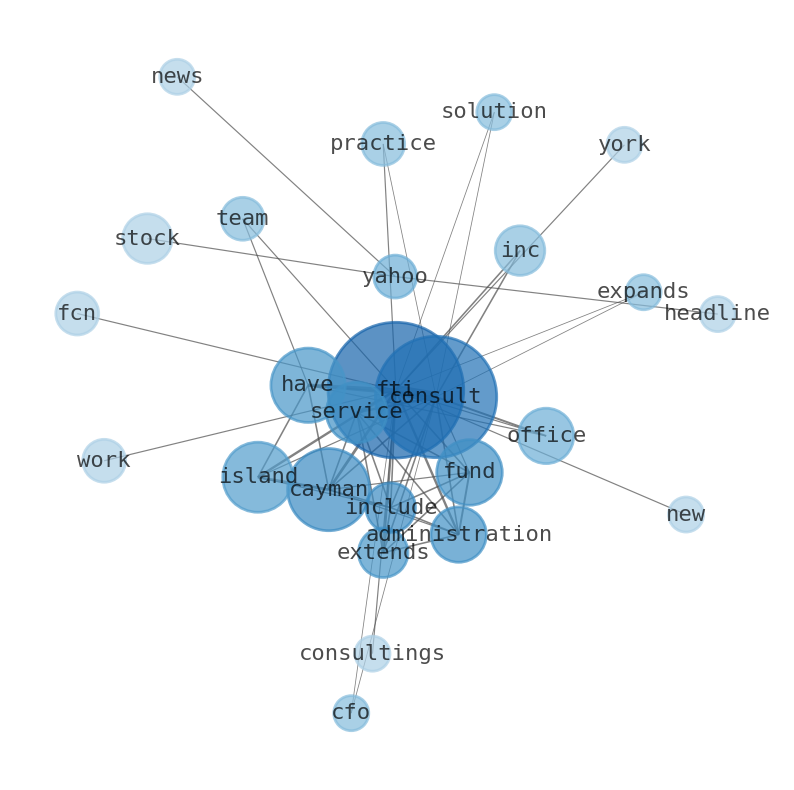 This document will help you to evaluate FTI Consulting without reading an infinite amount of sources. Relying only on stock quotes or prices to make investment decisions is a mistake. Analyzing and observing stock charts, highs and lows and other numerical data does not allow to evaluate the real value of a company. Stock quotes and prices are the result of underlying characteristics of a company and of events and news happening around them. For this reason, investing must be based on information, not numbers. As a solution, we programmed an artificial intelligence that reads the whole internet and the uses natural language processing and vectorizers to summarize the information. Usually, the AI reads several hundred pages and summarize it to a short document. This document presents our results. We found that the most common words in the internet about FTI Consulting are: FTI, Consulting, Cayman, Islands, consult, office, Fund, …