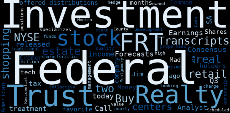This document will help you to evaluate Federal Realty Investment Trust without reading an infinite amount of sources. Relying only on stock quotes or prices to make investment decisions is a mistake. Analyzing and observing stock charts, highs and lows and other numerical data does not allow to evaluate the real value of a company. Stock quotes and prices are the result of underlying characteristics of a company and of events and news happening around them. For this reason, investing must be based on information, not numbers. As a solution, we programmed an artificial intelligence that reads the whole internet and the uses natural language processing and vectorizers to summarize the information. Usually, the AI reads several hundred pages and summarize it to a short document. This document presents our results. We found that the most common words in the internet about Federal Realty Investment Trust are: Federal, Realty, Investment, …