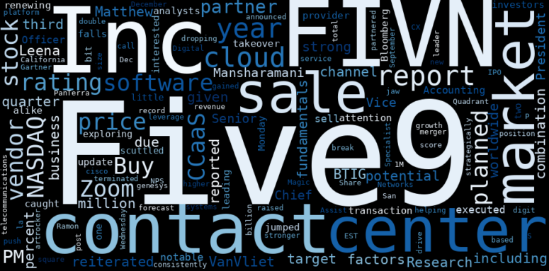 The game is changing. There is a new strategy to evaluate Five9 fundamental value, possible risks and most salient advantages. Investors have traditionally relied in reading large amounts of text to evaluate the fundamental value of a stock or company. However, the development of Artificial Intelligence (AI) tools is modifying the way investments are evaluated in markets. Today, machine learning, natural language processing and bigdata allow making this process automatic, reducing large amounts of text to the elements that have a higher activation in a neural network. We programmed an artificial intelligence that reads the whole internet and the uses natural language processing and vectorizers to summarize the information. Usually, the AI reads several hundred pages and summarize it to a short document. This document presents our results. We found that the most common words in the internet about Five9 are: Five9, FIVN, sale, center, Inc, report, year, and the …