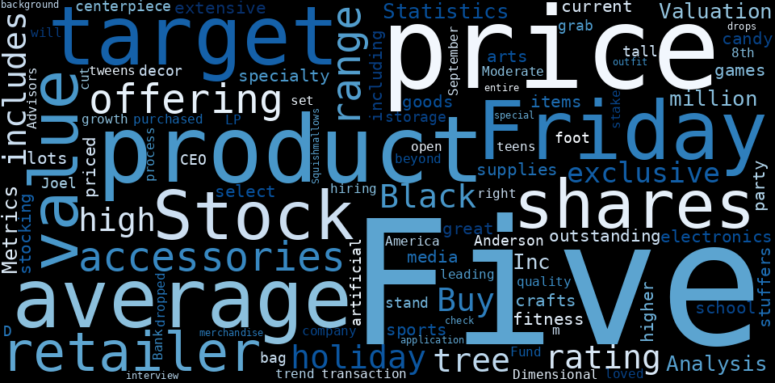 This document will help you to evaluate Five Below without reading an infinite amount of sources. Relying only on stock quotes or prices to make investment decisions is a mistake. Analyzing and observing stock charts, highs and lows and other numerical data does not allow to evaluate the real value of a company. Stock quotes and prices are the result of underlying characteristics of a company and of events and news happening around them. For this reason, investing must be based on information, not numbers. As a solution, we programmed an artificial intelligence that reads the whole internet and the uses natural language processing and vectorizers to summarize the information. Usually, the AI reads several hundred pages and summarize it to a short document. This document presents our results. We found that the most common words in the internet about Five Below are: price, Below, product, Five, target, include, Friday, …