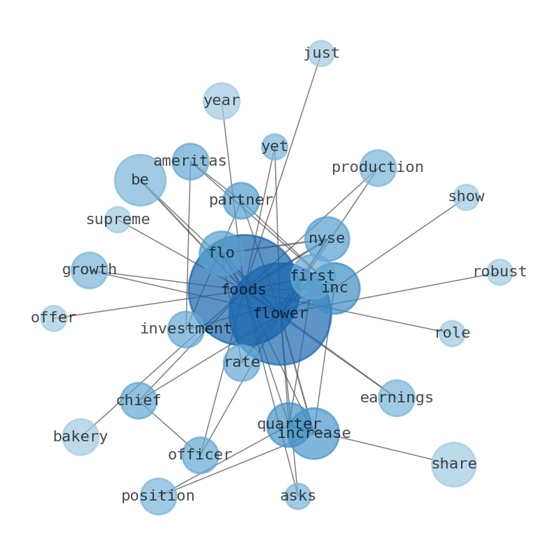 This document will help you to evaluate Flowers Foods without reading an infinite amount of sources. Relying only on stock quotes or prices to make investment decisions is a mistake. Analyzing and observing stock charts, highs and lows and other numerical data does not allow to evaluate the real value of a company. Stock quotes and prices are the result of underlying characteristics of a company and of events and news happening around them. For this reason, investing must be based on information, not numbers. As a solution, we programmed an artificial intelligence that reads the whole internet and the uses natural language processing and vectorizers to summarize the information. Usually, the AI reads several hundred pages and summarize it to a short document. This document presents our results. We found that the most common words in the internet about Flowers Foods are: Flowers, Foods, increase, food, Inc, share, first, …