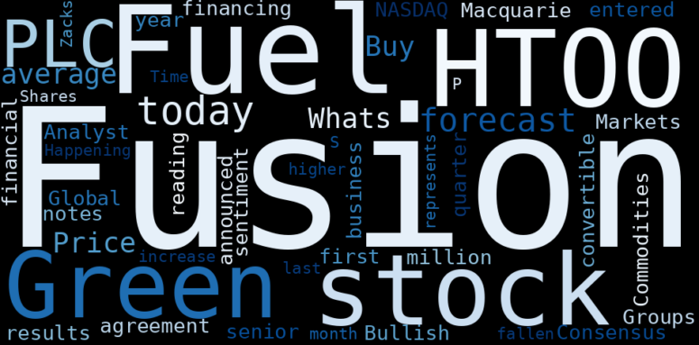 Are looking for the most relevant information about Fusion Fuel Green? Investor spend a lot of time searching for information to make investment decisions in Fusion Fuel Green. This task is often burdensome and consumes huge amounts of free time. It also leads to mistakes due to fatigue and bounded rationality. As a solution, we programmed an artificial intelligence that reads the whole internet and the uses natural language processing and vectorizers to summarize the information. Usually, the AI reads several hundred pages and summarize it to a short document. This document presents our results. We found that the most common words in the internet about Fusion Fuel Green are: Fusion, Fuel, HTOO, Green, stock, PLC, Buy, and the most common words in the summary are: energy, fuel, green, fusion, hydrogen, news, esg, . One of the sentences in the summary was: Fusion Fuel stock is higher by 1131% while …