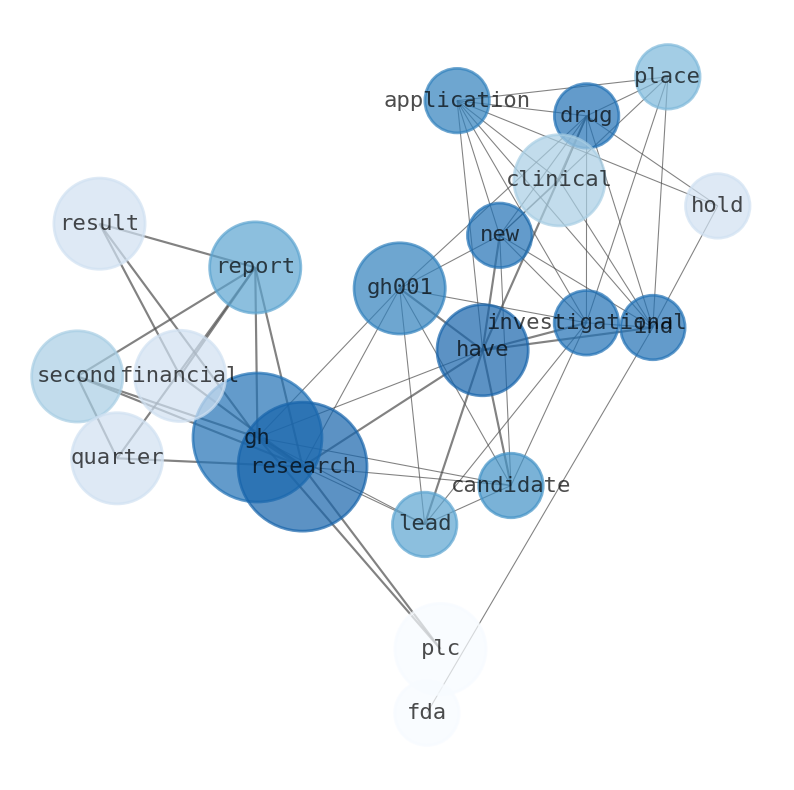 The game is changing. There is a new strategy to evaluate GH Research fundamental value, possible risks and most salient advantages. Investors have traditionally relied in reading large amounts of text to evaluate the fundamental value of a stock or company. However, the development of Artificial Intelligence (AI) tools is modifying the way investments are evaluated in markets. Today, machine learning, natural language processing and bigdata allow making this process automatic, reducing large amounts of text to the elements that have a higher activation in a neural network. We programmed an artificial intelligence that reads the whole internet and the uses natural language processing and vectorizers to summarize the information. Usually, the AI reads several hundred pages and summarize it to a short document. This document presents our results. We found that the most common words in the internet about GH Research are: GH, GH001, Research, PLC, report, second, quarter, …