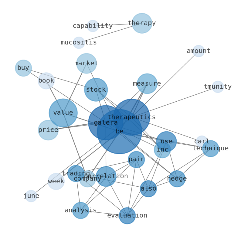 The game is changing. There is a new strategy to evaluate Galera Therapeutics fundamental value, possible risks and most salient advantages. Investors have traditionally relied in reading large amounts of text to evaluate the fundamental value of a stock or company. However, the development of Artificial Intelligence (AI) tools is modifying the way investments are evaluated in markets. Today, machine learning, natural language processing and bigdata allow making this process automatic, reducing large amounts of text to the elements that have a higher activation in a neural network. We programmed an artificial intelligence that reads the whole internet and the uses natural language processing and vectorizers to summarize the information. Usually, the AI reads several hundred pages and summarize it to a short document. This document presents our results. We found that the most common words in the internet about Galera Therapeutics are: Galera, Therapeutics, value, stock, use, measure, Inc, …