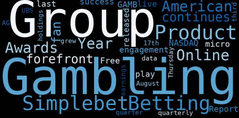 The game is changing. There is a new strategy to evaluate Gambling Group fundamental value, possible risks and most salient advantages. Investors have traditionally relied in reading large amounts of text to evaluate the fundamental value of a stock or company. However, the development of Artificial Intelligence (AI) tools is modifying the way investments are evaluated in markets. Today, machine learning, natural language processing and bigdata allow making this process automatic, reducing large amounts of text to the elements that have a higher activation in a neural network. We programmed an artificial intelligence that reads the whole internet and the uses natural language processing and vectorizers to summarize the information. Usually, the AI reads several hundred pages and summarize it to a short document. This document presents our results. We found that the most common words in the internet about Gambling Group are: Group, Simplebet, Gamblingcom, American, Gambling, Awards, Online, …
