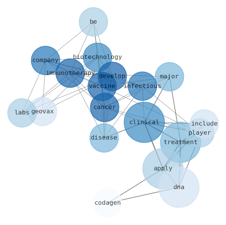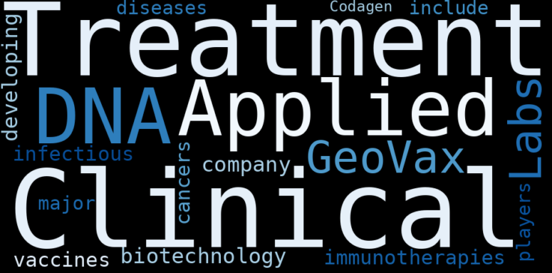 This document will help you to evaluate GeoVax Labs without reading an infinite amount of sources. Relying only on stock quotes or prices to make investment decisions is a mistake. Analyzing and observing stock charts, highs and lows and other numerical data does not allow to evaluate the real value of a company. Stock quotes and prices are the result of underlying characteristics of a company and of events and news happening around them. For this reason, investing must be based on information, not numbers. As a solution, we programmed an artificial intelligence that reads the whole internet and the uses natural language processing and vectorizers to summarize the information. Usually, the AI reads several hundred pages and summarize it to a short document. This document presents our results. We found that the most common words in the internet about GeoVax Labs are: Clinical, Treatment, Applied, DNA, GeoVax, Labs, biotechnology, and the most common words in the summary are: geovax, inc, lab, vaccine, company, report, labs, . One of the sentences in the summary was: The major players in the Clinical Treatment for Clinical Treatment include Applied DNA, Applied DNA and Codagen.. Other searches related to this term that the AI found were: stockmarketlive, livestock, stockmarketforbeginners, thestockmarket, stockmarkettoday, stockmarkettrading, stockmarketstocks, todaystockmarket, thestockmarket, marketnews, stockmarketnews, whatisstockmarket, usstockmarket, stockmarketopen. #geovax #inc #lab #vaccine #company #report #labs.