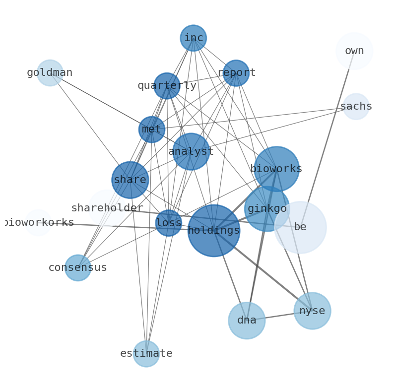 Are looking for the most relevant information about Ginkgo Bioworks Holdings? Investor spend a lot of time searching for information to make investment decisions in Ginkgo Bioworks Holdings. This task is often burdensome and consumes huge amounts of free time. It also leads to mistakes due to fatigue and bounded rationality. As a solution, we programmed an artificial intelligence that reads the whole internet and the uses natural language processing and vectorizers to summarize the information. Usually, the AI reads several hundred pages and summarize it to a short document. This document presents our results. We found that the most common words in the internet about Ginkgo Bioworks Holdings are: Holdings, Ginkgo, Bioworks, share, analyst, own, shareholder, and the most common words in the summary are: ginkgo, bioworks, stock, holding, market, news, dna, . One of the sentences in the summary was: Ginkgo Bioworks Holdings, Inc. Other searches related to …