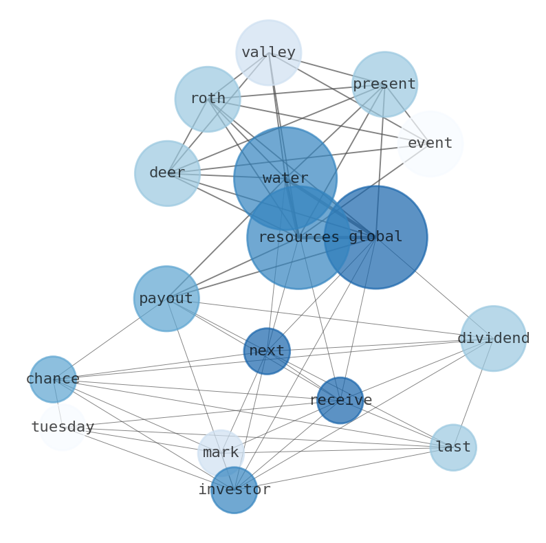 Are looking for the most relevant information about Global Water Resources? Investor spend a lot of time searching for information to make investment decisions in Global Water Resources. This task is often burdensome and consumes huge amounts of free time. It also leads to mistakes due to fatigue and bounded rationality. As a solution, we programmed an artificial intelligence that reads the whole internet and the uses natural language processing and vectorizers to summarize the information. Usually, the AI reads several hundred pages and summarize it to a short document. This document presents our results. We found that the most common words in the internet about Global Water Resources are: Global, Water, Resources, payout, resource, Tuesday, mark, and the most common words in the summary are: water, resource, global, quality, sensor, market, environmental, . One of the sentences in the summary was: Tuesday marks the last chance for investors to receive the next dividend payout from Global Water Resources GWRS. Other searches related to this term that the AI found were: stockmarketlive, livestock, stockmarketforbeginners, thestockmarket, stockmarkettoday, stockmarkettrading, stockmarketstocks, todaystockmarket, thestockmarket, marketnews, stockmarketnews, whatisstockmarket, usstockmarket, stockmarketopen. #water #resource #global #quality #sensor #market #environmental.