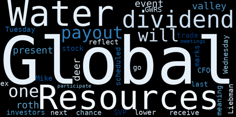 The game is changing. There is a new strategy to evaluate Global Water Resources fundamental value, possible risks and most salient advantages. Investors have traditionally relied in reading large amounts of text to evaluate the fundamental value of a stock or company. However, the development of Artificial Intelligence (AI) tools is modifying the way investments are evaluated in markets. Today, machine learning, natural language processing and bigdata allow making this process automatic, reducing large amounts of text to the elements that have a higher activation in a neural network. We programmed an artificial intelligence that reads the whole internet and the uses natural language processing and vectorizers to summarize the information. Usually, the AI reads several hundred pages and summarize it to a short document. This document presents our results. We found that the most common words in the internet about Global Water Resources are: Global, Water, Resources, payout, resource, …