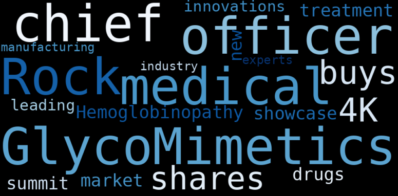 Are looking for the most relevant information about GlycoMimetics? Investor spend a lot of time searching for information to make investment decisions in GlycoMimetics. This task is often burdensome and consumes huge amounts of free time. It also leads to mistakes due to fatigue and bounded rationality. As a solution, we programmed an artificial intelligence that reads the whole internet and the uses natural language processing and vectorizers to summarize the information. Usually, the AI reads several hundred pages and summarize it to a short document. This document presents our results. We found that the most common words in the internet about GlycoMimetics are: GlycoMimetics, chief, medical, officer, Rock, buy, share, and the most common words in the summary are: inc, corp, group, holding, ltd, therapeutic, technology, . One of the sentences in the summary was: Hemoglobinopathy treatment drugs market summit to showcase new innovations from leading manufacturing and industry …