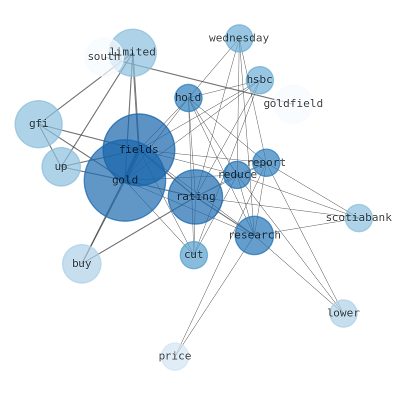 This document will help you to evaluate Gold Fields without reading an infinite amount of sources. Relying only on stock quotes or prices to make investment decisions is a mistake. Analyzing and observing stock charts, highs and lows and other numerical data does not allow to evaluate the real value of a company. Stock quotes and prices are the result of underlying characteristics of a company and of events and news happening around them. For this reason, investing must be based on information, not numbers. As a solution, we programmed an artificial intelligence that reads the whole internet and the uses natural language processing and vectorizers to summarize the information. Usually, the AI reads several hundred pages and summarize it to a short document. This document presents our results. We found that the most common words in the internet about Gold Fields are: Gold, Fields, rating, research, New, South, GFI, …