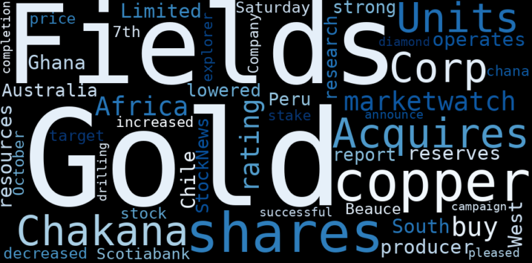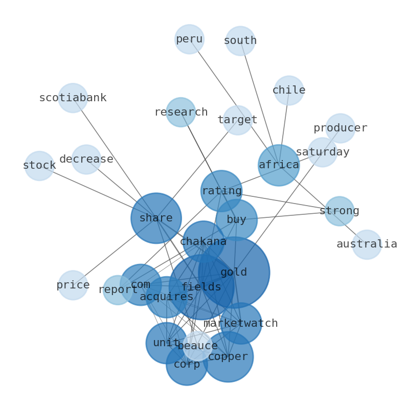 Are looking for the most relevant information about Gold Fields? Investor spend a lot of time searching for information to make investment decisions in Gold Fields. This task is often burdensome and consumes huge amounts of free time. It also leads to mistakes due to fatigue and bounded rationality. As a solution, we programmed an artificial intelligence that reads the whole internet and the uses natural language processing and vectorizers to summarize the information. Usually, the AI reads several hundred pages and summarize it to a short document. This document presents our results. We found that the most common words in the internet about Gold Fields are: Gold, Fields, share, copper, Africa, rating, Acquires, and the most common words in the summary are: gold, stock, news, mining, report, project, company, . One of the sentences in the summary was: Gold Fields acquires units of chakana copper corp. Other searches related …