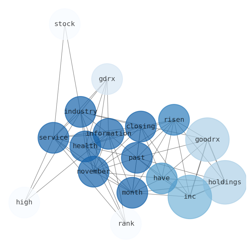 The game is changing. There is a new strategy to evaluate GoodRx Holdings fundamental value, possible risks and most salient advantages. Investors have traditionally relied in reading large amounts of text to evaluate the fundamental value of a stock or company. However, the development of Artificial Intelligence (AI) tools is modifying the way investments are evaluated in markets. Today, machine learning, natural language processing and bigdata allow making this process automatic, reducing large amounts of text to the elements that have a higher activation in a neural network. We programmed an artificial intelligence that reads the whole internet and the uses natural language processing and vectorizers to summarize the information. Usually, the AI reads several hundred pages and summarize it to a short document. This document presents our results. We found that the most common words in the internet about GoodRx Holdings are: Holdings, Inc, GoodRx, risen, month, closing, November, …