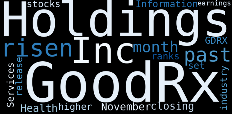 Are looking for the most relevant information about GoodRx Holdings? Investor spend a lot of time searching for information to make investment decisions in GoodRx Holdings. This task is often burdensome and consumes huge amounts of free time. It also leads to mistakes due to fatigue and bounded rationality. As a solution, we programmed an artificial intelligence that reads the whole internet and the uses natural language processing and vectorizers to summarize the information. Usually, the AI reads several hundred pages and summarize it to a short document. This document presents our results. We found that the most common words in the internet about GoodRx Holdings are: Holdings, Inc, GoodRx, risen, month, closing, November, and the most common words in the summary are: inc, holding, goodrx, ltd, corp, group, co, . One of the sentences in the summary was: In the Health Information Services industry, GDRX ranks higher than 82% of stocks. Other searches related to this term that the AI found were: stockmarketlive, livestock, stockmarketforbeginners, thestockmarket, stockmarkettoday, stockmarkettrading, stockmarketstocks, todaystockmarket, thestockmarket, marketnews, stockmarketnews, whatisstockmarket, usstockmarket, stockmarketopen. #inc #holding #goodrx #ltd #corp #group #co.