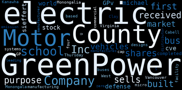 The game is changing. There is a new strategy to evaluate GreenPower Motor Company fundamental value, possible risks and most salient advantages. Investors have traditionally relied in reading large amounts of text to evaluate the fundamental value of a stock or company. However, the development of Artificial Intelligence (AI) tools is modifying the way investments are evaluated in markets. Today, machine learning, natural language processing and bigdata allow making this process automatic, reducing large amounts of text to the elements that have a higher activation in a neural network. We programmed an artificial intelligence that reads the whole internet and the uses natural language processing and vectorizers to summarize the information. Usually, the AI reads several hundred pages and summarize it to a short document. This document presents our results. We found that the most common words in the internet about GreenPower Motor Company are: County, GreenPower, Motor, Company, school, …