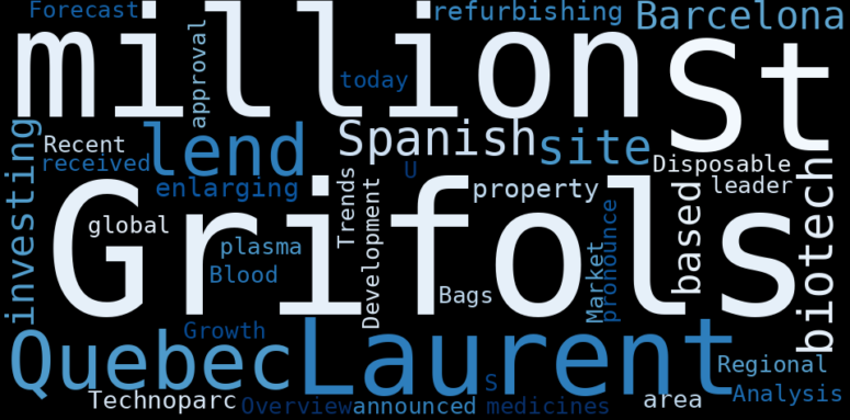 Are looking for the most relevant information about Grifols? Investor spend a lot of time searching for information to make investment decisions in Grifols. This task is often burdensome and consumes huge amounts of free time. It also leads to mistakes due to fatigue and bounded rationality. As a solution, we programmed an artificial intelligence that reads the whole internet and the uses natural language processing and vectorizers to summarize the information. Usually, the AI reads several hundred pages and summarize it to a short document. This document presents our results. We found that the most common words in the internet about Grifols are: Grifols, Quebec, lend, Spanish, biotech, StLaurent, site, and the most common words in the summary are: grifols, human, prothrombin, complex, news, market, get, . One of the sentences in the summary was: Barcelona-based Grifols is investing about $150 million in refurbishing and enlarging a property in …
