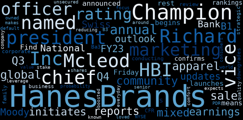 Are looking for the most relevant information about Hanesbrands? Investor spend a lot of time searching for information to make investment decisions in Hanesbrands. This task is often burdensome and consumes huge amounts of free time. It also leads to mistakes due to fatigue and bounded rationality. As a solution, we programmed an artificial intelligence that reads the whole internet and the uses natural language processing and vectorizers to summarize the information. Usually, the AI reads several hundred pages and summarize it to a short document. This document presents our results. We found that the most common words in the internet about Hanesbrands are: HanesBrands, Hanesbrands, Champion, HBI, Richard, Mcleod, name, and the most common words in the summary are: hanesbrands, news, inc, sale, stock, hbi, global, . One of the sentences in the summary was: Richard Mcleod named vice president of Champion.. Other searches related to this term that …