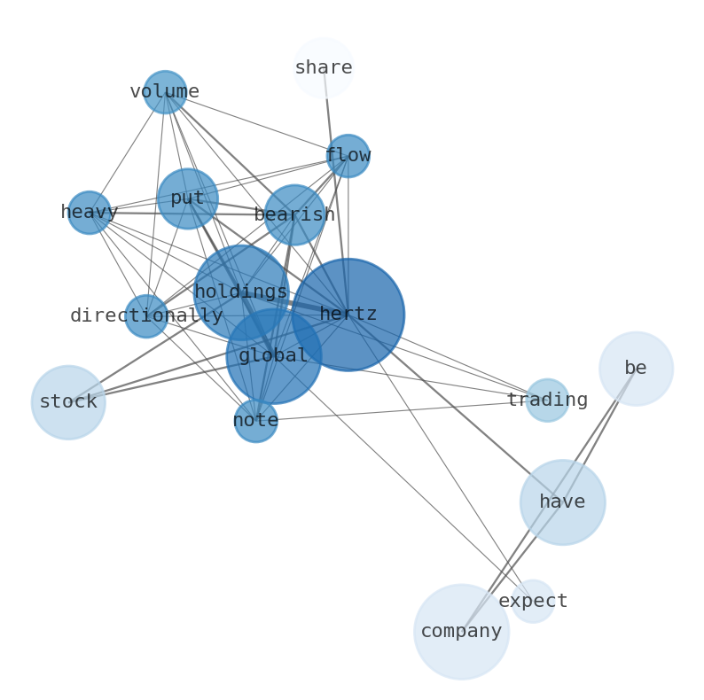 Are looking for the most relevant information about Hertz Global Holdings? Investor spend a lot of time searching for information to make investment decisions in Hertz Global Holdings. This task is often burdensome and consumes huge amounts of free time. It also leads to mistakes due to fatigue and bounded rationality. As a solution, we programmed an artificial intelligence that reads the whole internet and the uses natural language processing and vectorizers to summarize the information. Usually, the AI reads several hundred pages and summarize it to a short document. This document presents our results. We found that the most common words in the internet about Hertz Global Holdings are: Hertz, Holdings, company, Global, stock, put, global, and the most common words in the summary are: hertz, market, global, car, holding, rental, enterprise, . One of the sentences in the summary was: Bearish flow noted in Hertz global Holdings with …