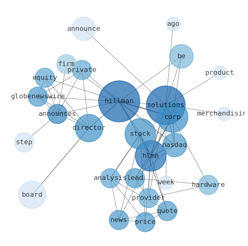 This document will help you to evaluate Hillman Solutions without reading an infinite amount of sources. Relying only on stock quotes or prices to make investment decisions is a mistake. Analyzing and observing stock charts, highs and lows and other numerical data does not allow to evaluate the real value of a company. Stock quotes and prices are the result of underlying characteristics of a company and of events and news happening around them. For this reason, investing must be based on information, not numbers. As a solution, we programmed an artificial intelligence that reads the whole internet and the uses natural language processing and vectorizers to summarize the information. Usually, the AI reads several hundred pages and summarize it to a short document. This document presents our results. We found that the most common words in the internet about Hillman Solutions are: Hillman, Corp, Solutions, Directors, Board, HLMN, stock, …